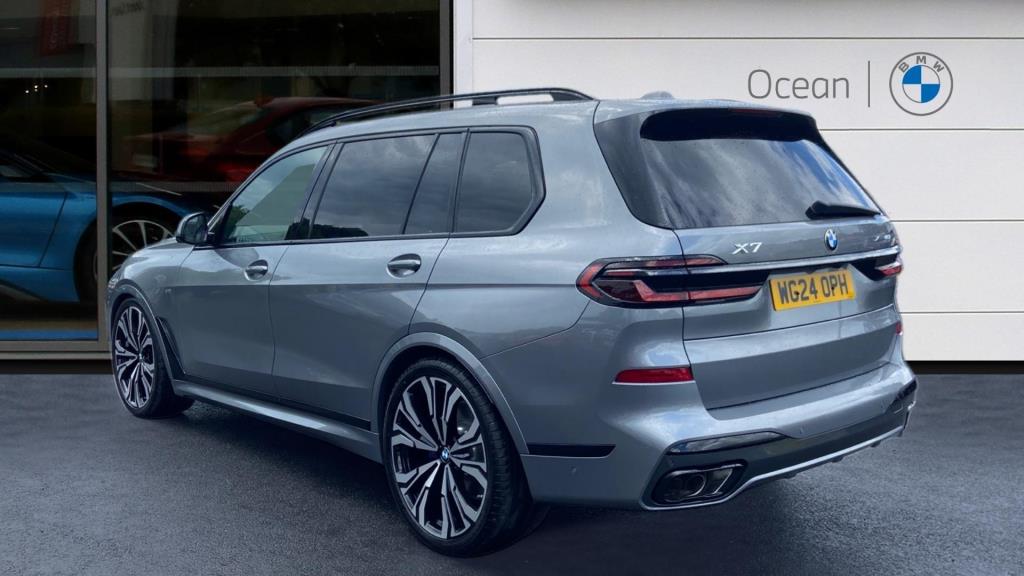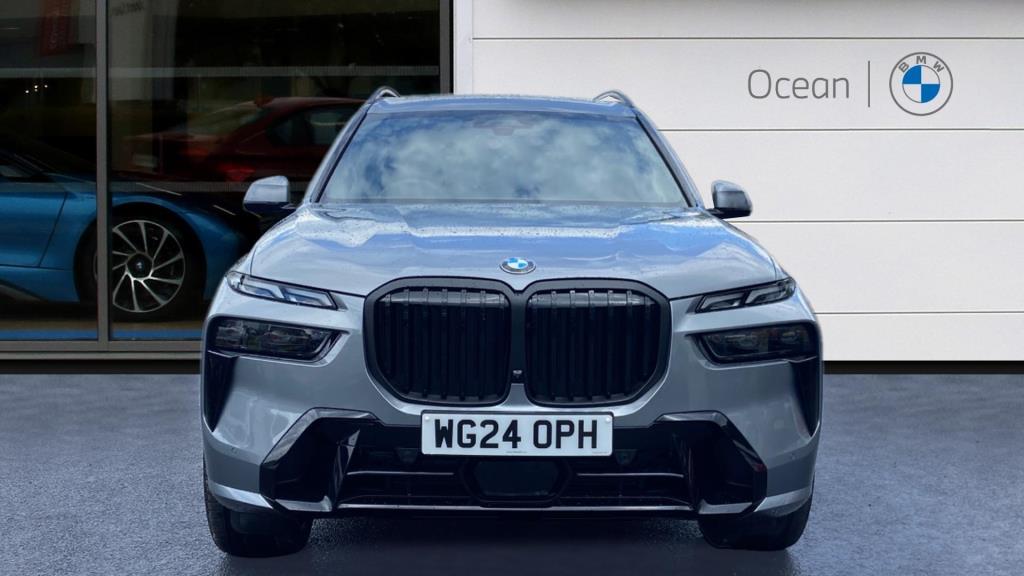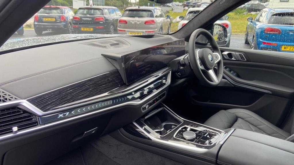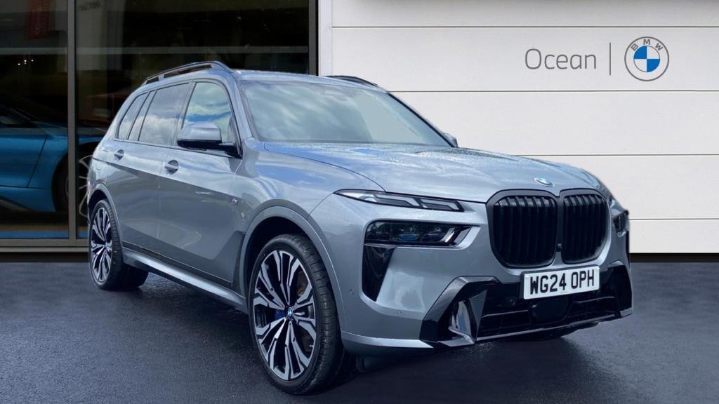 This is a BMW X7 40i M Sport, a petrol hybrid car registered in 2024. With only one previous owner and low mileage of 5921 miles, this four-wheel drive boasts a 3.0-litre engine and a spacious interior with seven seats. The vehicle is equipped with the M Sport trim, enhancing its sporty appeal. It also features the Driving Assistant Professional and Technology Plus Pack, offering advanced driving assistance and technological enhancements. The Sky Lounge Panoramic Glass Sunroof adds a touch of luxury, creating an open and airy cabin environment. This vehicle meets Euro 6 emission standards.