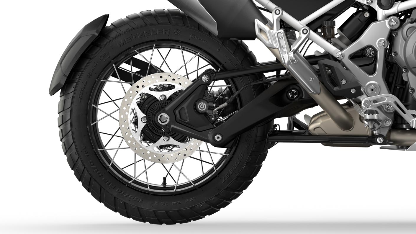 New 21” tubeless spoked front wheel with enhanced ground clearance delivers a ride that’s as purposeful as it looks, no matter how testing the track or rutted the road.