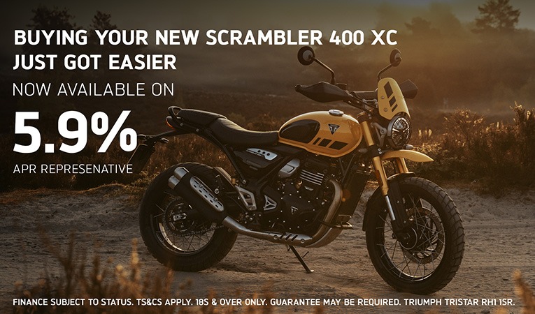 Finance subject to status. Retail sales only. Subject to availability at participating dealers on motorcycles registered between 04.03.26 and 31.03.26. Ts&Cs Apply. 18+. Guarantee may be required. Santander Consumer Finance, RH1 1SR. At the end of the PCP agreement there are three options: (1) Pay the optional final payment to own the motorcycle, (2) Return the motorcycle or (3) Part exchange the motorcycle where equity is available. Further charges may be made subject to condition or mileage of the motorcycle. Figures are correct at the time of print and may be subject to change. Triumph UK reserve the right to change offers at any time without notice and are subject to Availability.