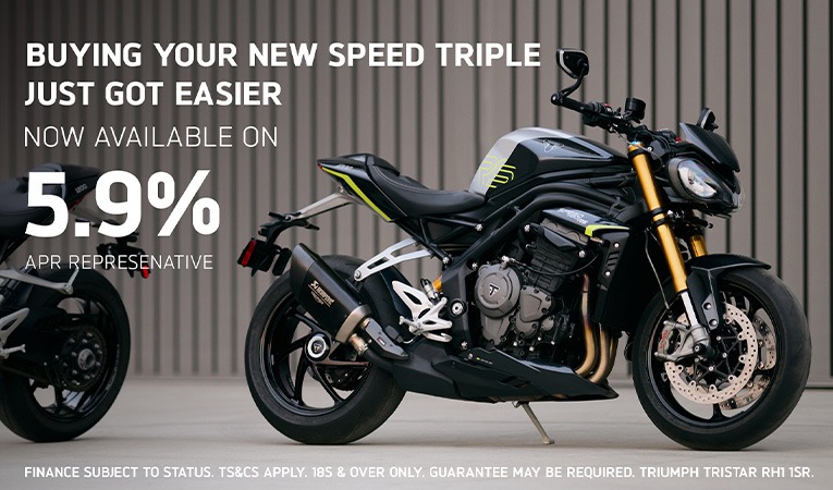 Finance subject to status. Retail sales only. Subject to availability at participating dealers on motorcycles registered between 01.01.26 and 31.03.26. Ts&Cs Apply. 18+. Guarantee may be required. Santander Consumer Finance, RH1 1SR. At the end of the PCP agreement there are three options: (1) Pay the optional final payment to own the motorcycle, (2) Return the motorcycle or (3) Part exchange the motorcycle where equity is available. Further charges may be made subject to condition or mileage of the motorcycle. Figures are correct at the time of print and may be subject to change. Triumph UK reserve the right to change offers at any time without notice and are subject to Availability.