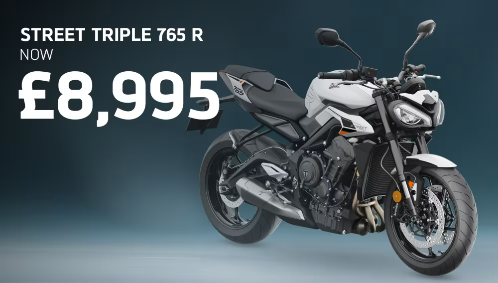 Terms and Conditions: *Offer valid on new Triumph Street Triple R models ordered and registered between 15th August 2025 and 31 October 2025, or while stocks last. Up to £1,100 price or finance deposit contribution from Triumph Motorcycles UK Ltd applied to reduce the purchase price to £8,995. RRP previously £10,095. Available at participating UK authorised Triumph dealerships only. Subject to availability. Not redeemable for cash. Cannot be used in conjunction with any other offer. On-the-road price shown includes VAT, delivery, registration, and license fees. Triumph Motorcycles UK Ltd reserves the right to amend or withdraw this offer at any time without prior notice and price may vary at dealerships.