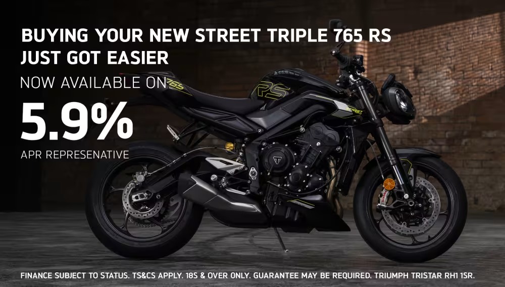 Finance subject to status. Retail sales only. Subject to availability at participating dealers on motorcycles registered between 01.01.26 and 31.03.26. Ts&Cs Apply. 18+. Guarantee may be required. Santander Consumer Finance, RH1 1SR. At the end of the PCP agreement there are three options: (1) Pay the optional final payment to own the motorcycle, (2) Return the motorcycle or (3) Part exchange the motorcycle where equity is available. Further charges may be made subject to condition or mileage of the motorcycle. Figures are correct at the time of print and may be subject to change. Triumph UK reserve the right to change offers at any time without notice and are subject to Availability.